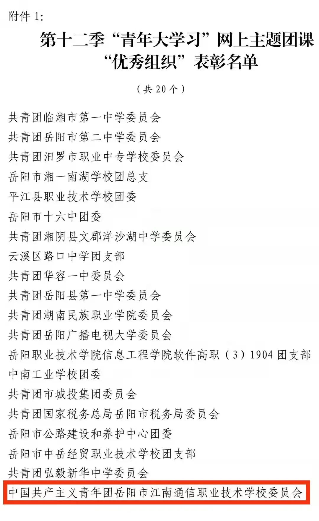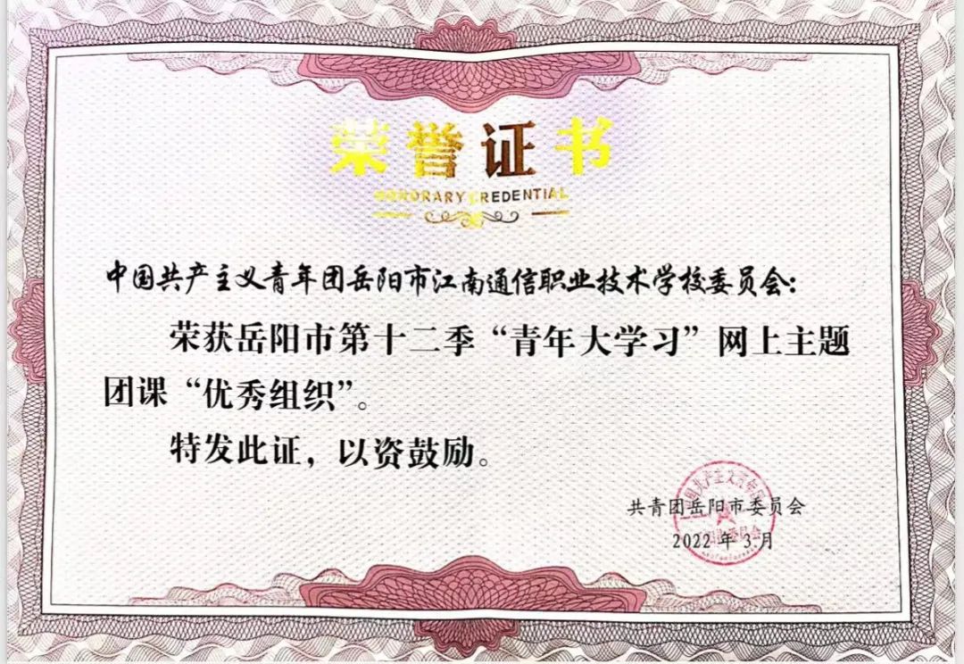 近日,從共青團岳陽市委員會傳來消息,我校榮獲岳陽市第十二季“青年大學習”網(wǎng)上主題團課“優(yōu)秀組織獎”。